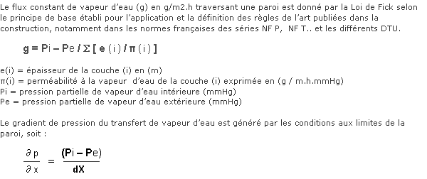 Les pressions partielles Pi et Pe sont fonction de la pression de saturation de l’air ambiant lié à sa température et au degré d’humidité relative (HR) de l’air, soit : PE = PE (Te) x HR(e) L’air ambiant se compose d’air sec et d’air humide en phase vapeur d’eau. Dans les locaux le taux d’humidité absolu de l’air intérieur est principalement lié à la production de vapeur d’eau (individus, activités, cuisine, toilette, présence de plantes, douches, lavage des sols, etc…) et au taux de renouvellement d’air du local en vol.h/h.