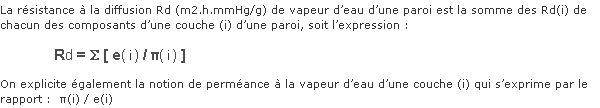 | La perméabilité à la vapeur d’eau d’un matériau est obtenue par la mesure du flux de vapeur d’eau traversant un échantillon soumis à un gradient de pression de vapeur d’eau de 11mmHg actuellement retenu selon la méthode d’essai définie par la norme ISO 77/83-2 (gradient de pression à 23°C produit par d(%)HR = 100% - 50% retenue pour la valeur du flux traversant le film dans la présente étude). (Nota : 45mmHg dans une enceinte à 38°C/ 90% selon les normes anciennes n° NF N 84-402 et NF T 56-131). Par pesées successives on mesure ainsi la variation en masse de vapeur d’eau dans une coupelle jusqu’à variation de masse sensiblement constante entre deux pesées successives. Les valeurs de perméabilité des matériaux résultants de cette méthodologie d’essais et retenues sont celles mentionnées dans les recommandations et documents normatifs français constituants les règles de l’art . |