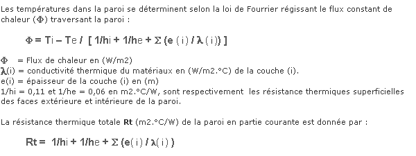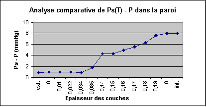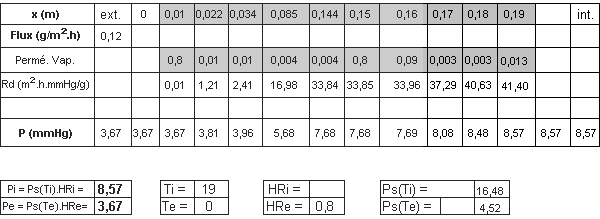 | Les tableaux ci-dessous indiquent les valeurs des paramètres T(°C), P(mmHg), Ps (mmHg), Rt (m2.°C/w), Rd (m2.h.mmHg/g) obtenus dans la paroi. | ||||||||||